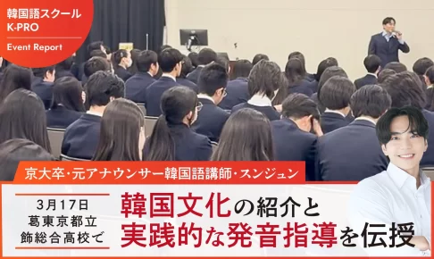 2026年3月17日、K-PRO代表のスンジュン氏が東京都立葛飾総合高等学校で、韓国修学旅行に向けた事前学習特別講演会を2回目として実施しました。この講演では、韓国の最新トレンドや日韓文化の違い、実践的な韓国語フレーズの発音指導が行われ、生徒たちは現地でのコミュニケーションに役立つ知識とスキルを楽しく学びました。