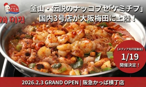 韓国・釜山で50年以上の歴史を持つ海鮮鍋ナッコプセ専門店「ケミチプ」の国内3号店が、2026年2月3日(火)に大阪梅田の阪急かっぱ横丁にグランドオープンします。日本初のセルフバーを導入し、自分好みの味にアレンジできるのが特徴です。グランドオープンに先立ち、メディア向け先行試食会の招待も開始されました。