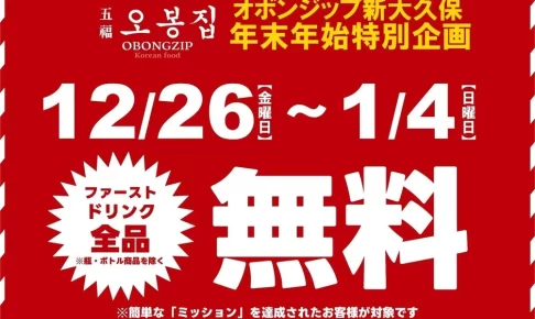 2025年12月8日にグランドオープンした「五福オボンジップ 新大久保店」が、12月26日(金)から年末年始特別企画を開催します。ファーストドリンク無料サービスや、新メニュー「ヨンポタン」の販売を開始し、韓国の家庭料理をお得に楽しめます。
