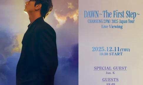 2PMのCHANSUNGが2025年12月11日(木)に開催するソロツアー追加公演『CHANSUNG(2PM) 2025 Japan Tour [DAWN~The First Step~]』が、全国の映画館とオンラインで生配信されます。Jun. K、AK-69、CHANGMIN(2AM)といった豪華ゲストも登場する見逃せないステージです!