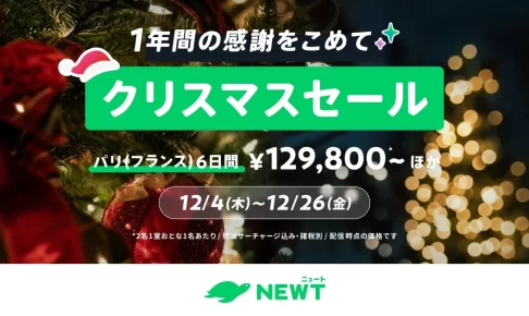 旅行アプリ『NEWT(ニュート)』が、2025年12月4日から12月26日まで「クリスマスセール」を開催します。海外旅行が18,800円から楽しめるほか、人気のハワイツアーや添乗員付きヨーロッパ周遊ツアーも特別価格で提供されるとのことです。毎週土日には最大50%オフクーポンも配布されるので、ぜひチェックしてみてください。