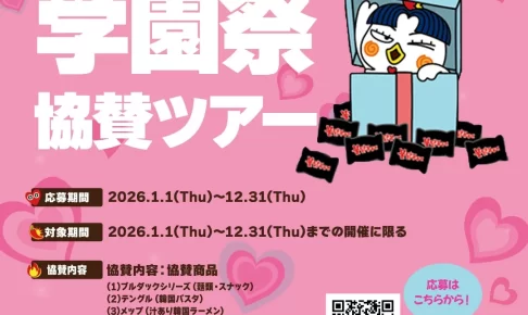 韓国で大人気のブランド「ブルダック」を展開する株式会社三養ジャパンが、2025年に日本全国の大学180校との協賛を達成しました!キャンパスイベントや学園祭などを通じて若年層に熱狂を届け、2026年もこの活動を積極的に続ける予定です。ブルダックだけでなく、さまざまな韓国の食文化を紹介していきます。