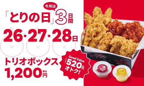 bb.q オリーブチキンカフェは、毎月恒例の「とりの日」を2025年12月限定で26日、27日、28日の3日間拡大開催します。期間中、人気チキン3種と選べるディップソース2種が入った「トリオボックス」を、積上げ価格から520円お得な1,200円(税込)で楽しめます。